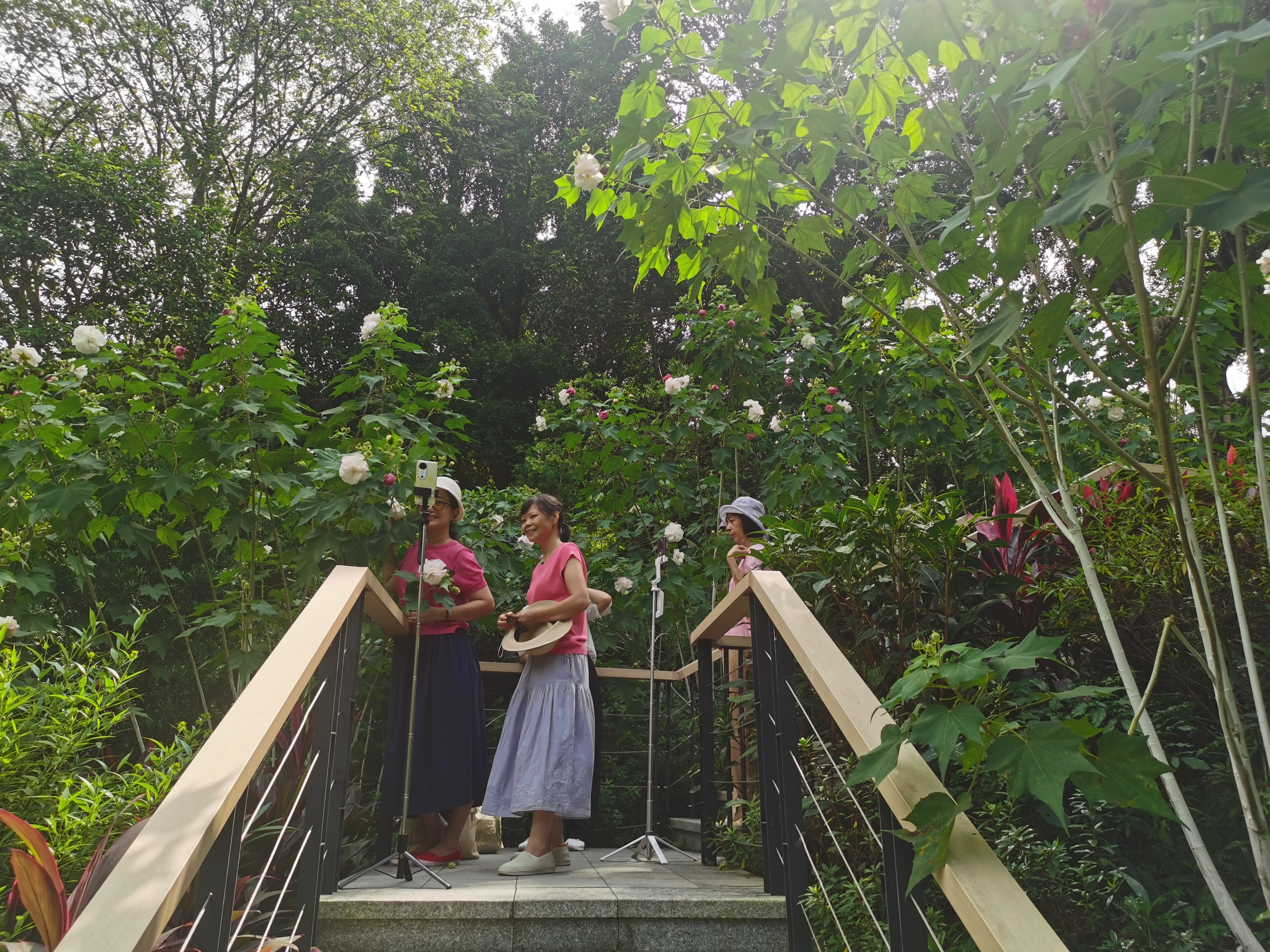 永泰乒乓体育公园的木芙蓉花迎来盛花期,眩惑了市民前来赏花打卡。