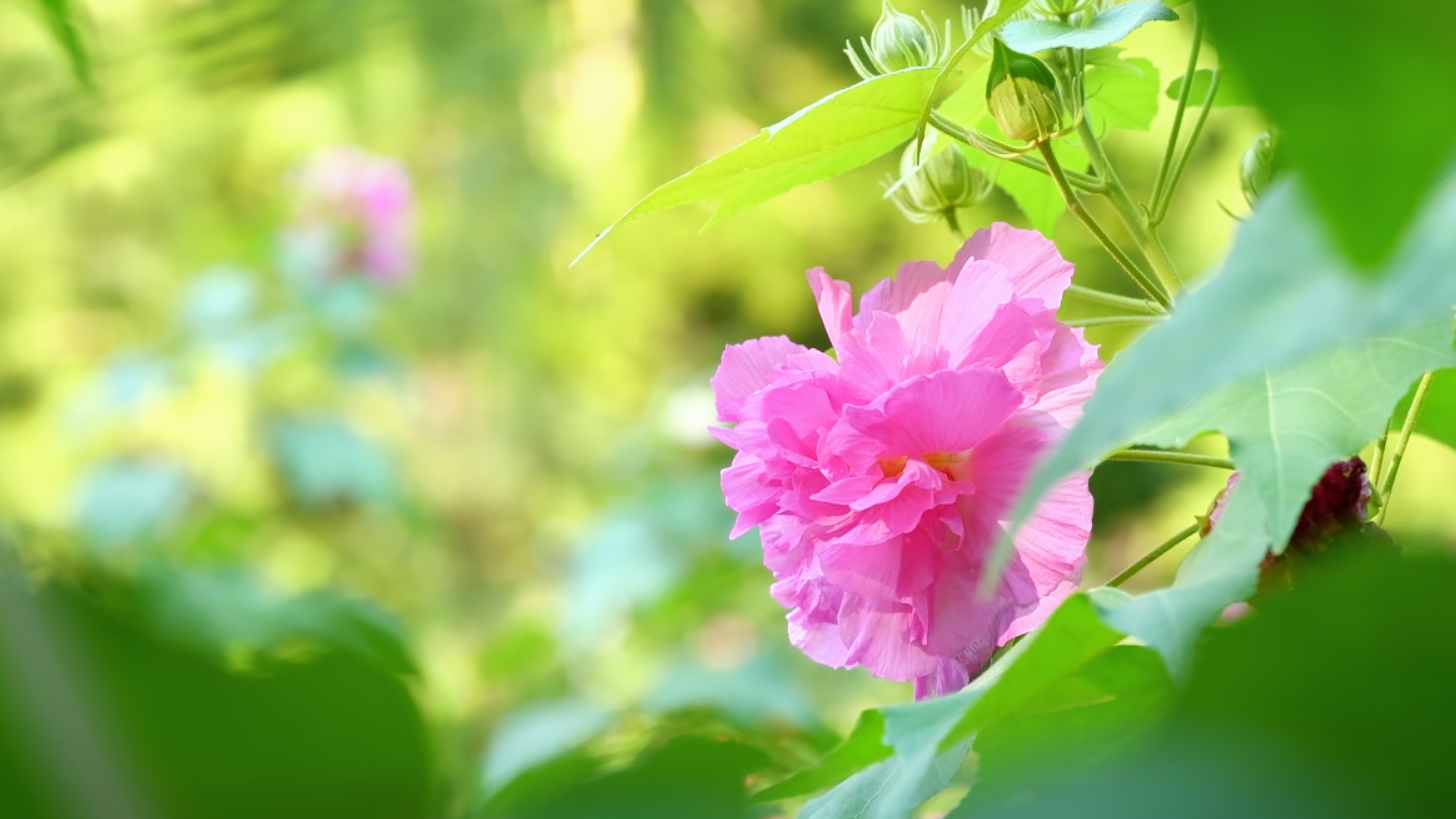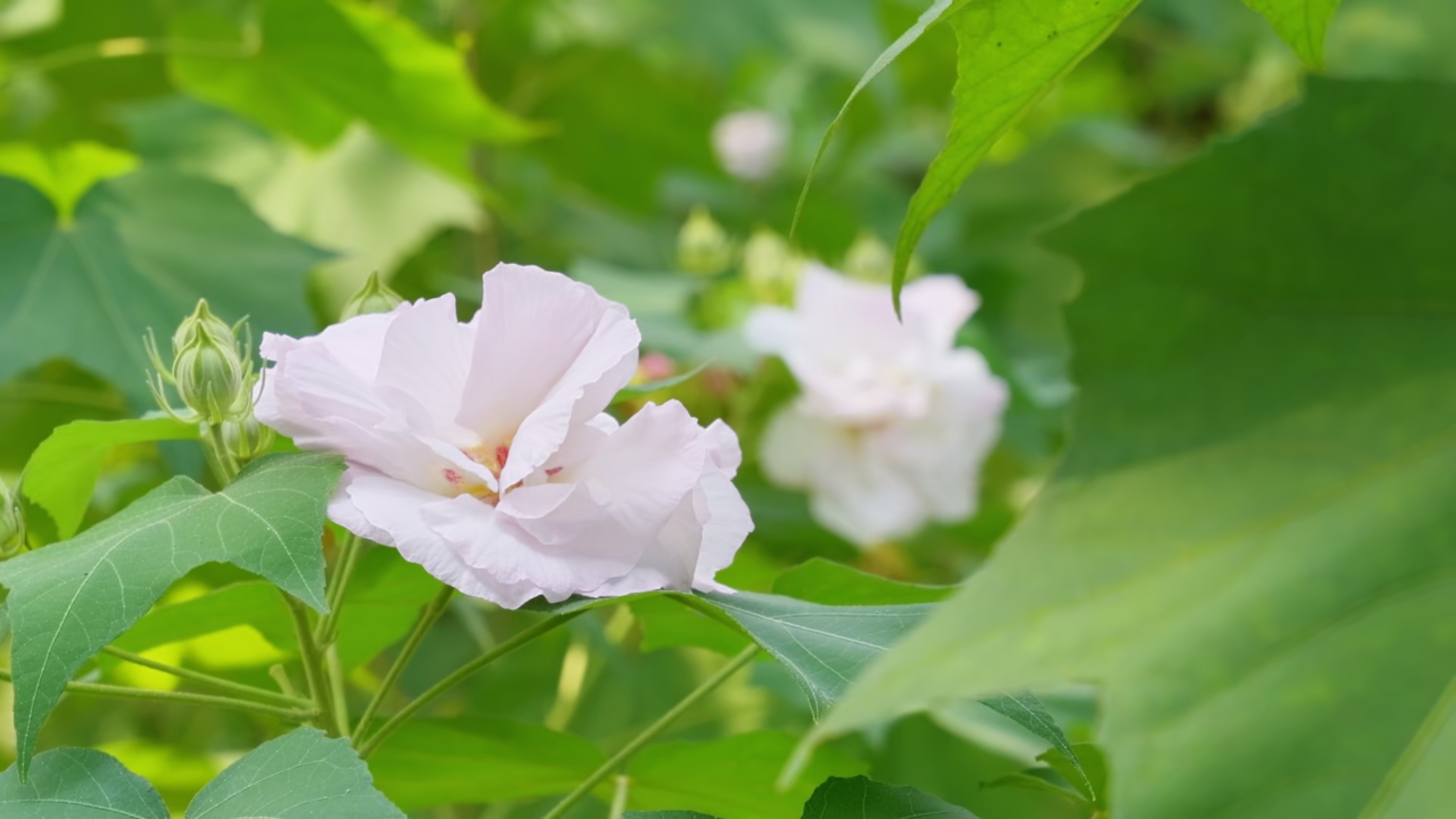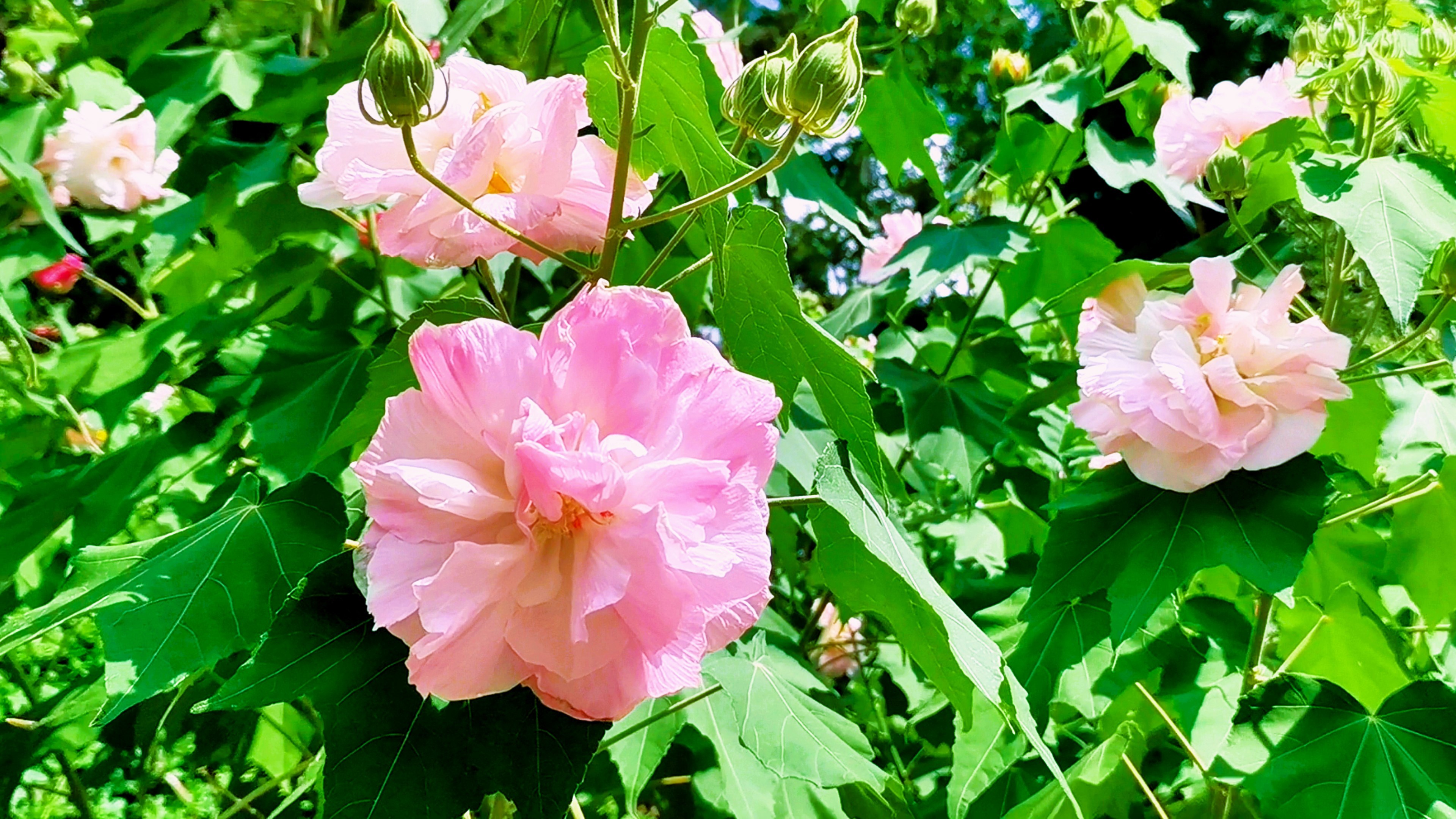 木芙蓉花跟着光照增强和温度升高,花色合手续变深,一日三变。